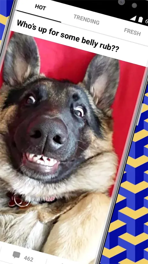 الواجهة الرئيسية في تطبيق 9GAG Fun مصممة بأسلوب بسيط ومنظم ليسهل التعامل معها حتى للمستخدمين الجدد. في أعلى الشاشة يوجد شريط تبويبات يضم أقسام Hot للمحتوى الرائج و Fresh للأحدث و Trending للأكثر شعبية حالياً مع إمكانية التنقل بينها بسرعة. في منتصف الواجهة تظهر الخلاصة بتمرير لا نهائي يتم تحميله تلقائياً دون توقف. أما في الأسفل فيوجد شريط تنقل رئيسي يحتوي على الصفحة الرئيسية والبحث والإشعارات والملف الشخصي، مما يتيح الوصول لأي قسم بسهولة تامة بنقرة واحدة فقط.
