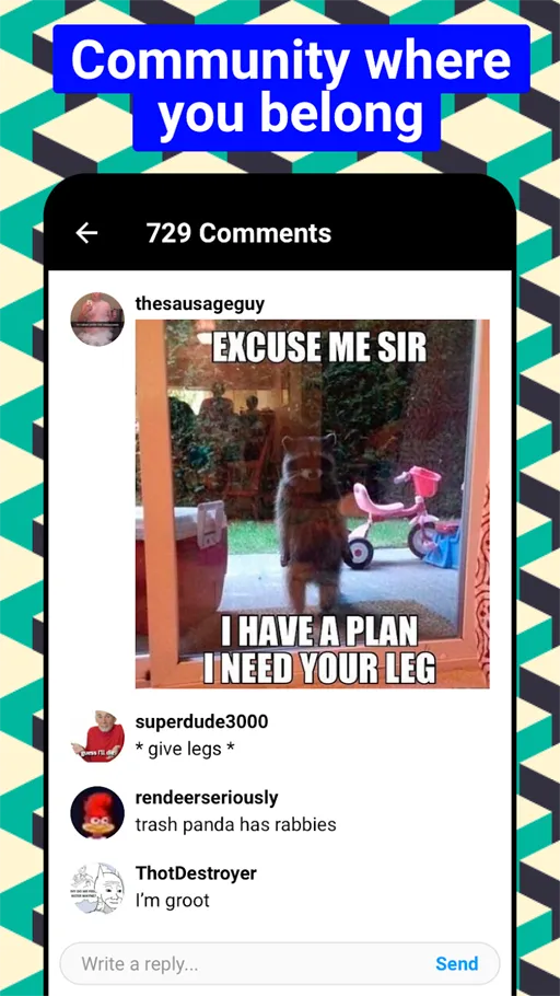 بعد استكشاف ميزة التصفح والاكتشاف الأساسية يأتي الدور على الجانب الاجتماعي الذي يمنح التطبيق طابعاً مختلفاً عن مجرد معرض محتوى عادي. يحتوي تطبيق 9GAG من ترايد مود على مجتمع نشط يضم مستخدمين يتميزون بخفة الظل وروح الدعابة، مما يضيف قيمة حقيقية لكل منشور عبر التعليقات والنقاشات الكوميدية. عند فتح أي منشور يمكنك قراءة مئات التعليقات التي تكون أحياناً أكثر إمتاعاً من المحتوى نفسه. يتم ترتيب التعليقات بناءً على التصويتات بحيث يظهر الأكثر طرافة وتفاعلاً في الأعلى دائماً ليسهل الوصول إليه بسرعة.